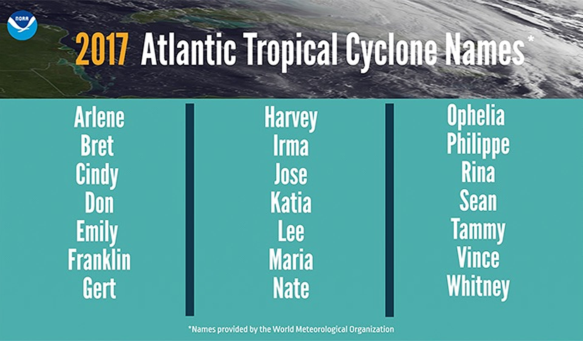 Major storms that originate in the North Atlantic Ocean are named from an alphabetical list composed by the National Hurricane Center in Miami. The 2017 list starts with the name Arlene and ends with the name Whitney. The storm that eventually became Hurricane Harvey was the eighth major storm of the 2017 Atlantic hurricane season. The eighth name on the 2017 National Hurricane Center list is Harvey, hence the name Hurricane Harvey